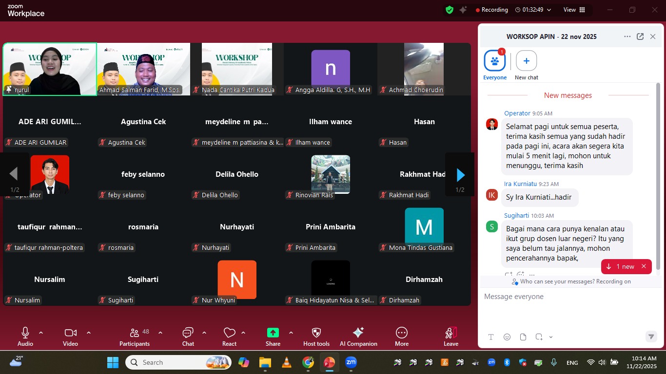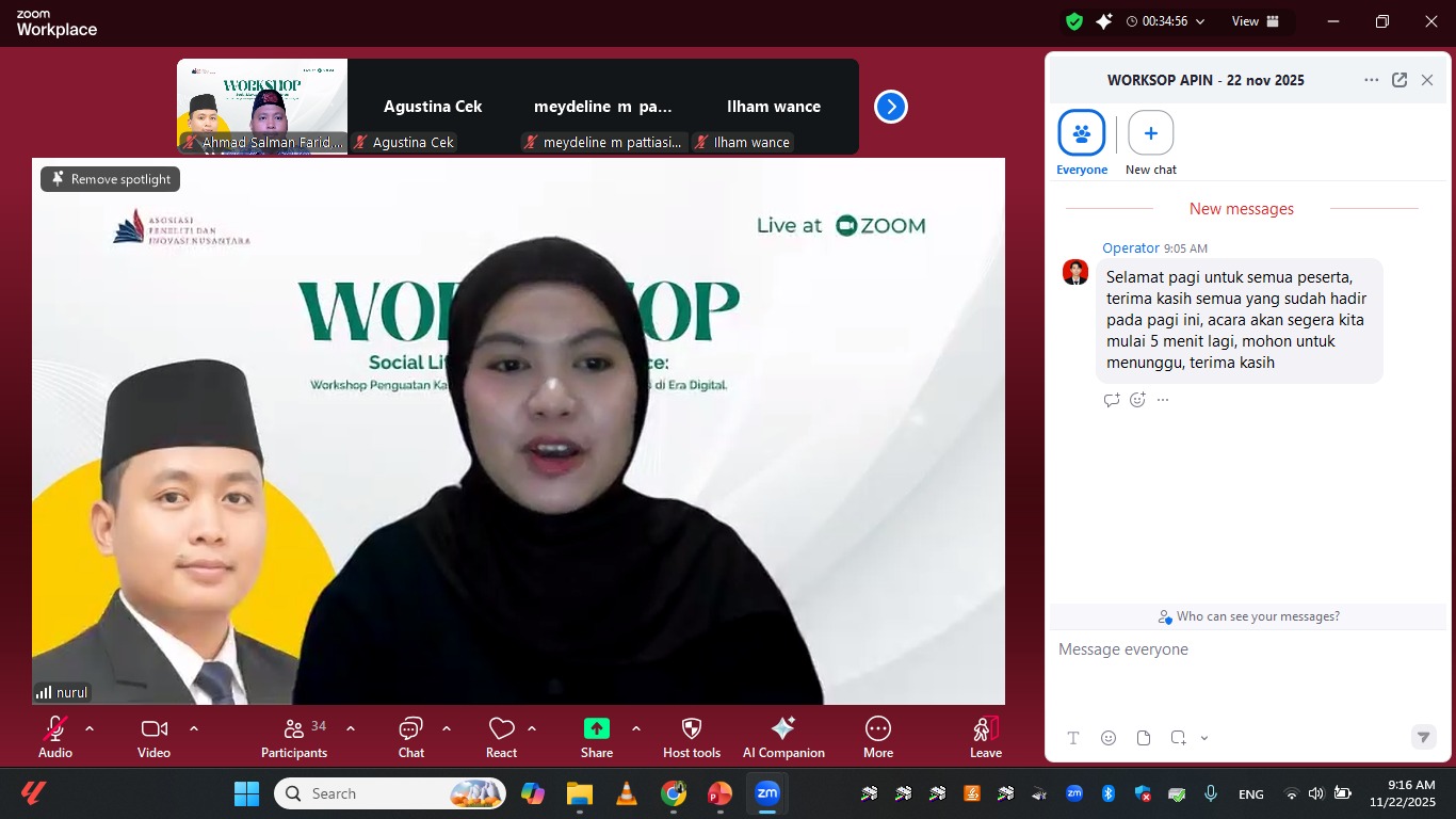 Kegiatan yang mengangkat tema “Social Literacy & Academic Voice: Penguatan Kapasitas Komunikasi Publik Akademisi di Era Digital” ini diikuti akademisi, guru, peneliti, dan mahasiswa dari berbagai daerah di Indonesia. Sejak awal kegiatan, suasana diskusi berjalan hidup di bawah panduan moderator Nurul yang memastikan setiap sesi berlangsung interaktif dan terarah. Kehadiran moderator yang komunikatif membuat jalannya webinar terasa dinamis dan nyaman bagi seluruh peserta.